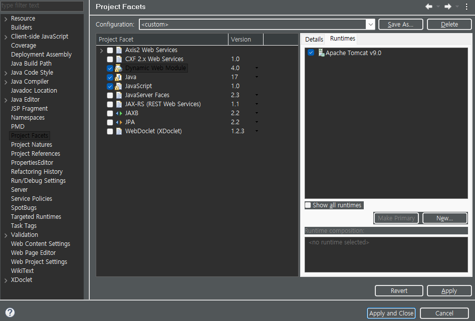 - Dynamic Web Module → Runtime → Apache Tomcat vX.X 선택