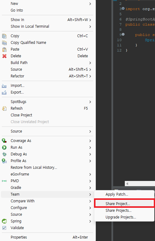 5. 프로젝트 우클릭 → Team → Share Project → Git